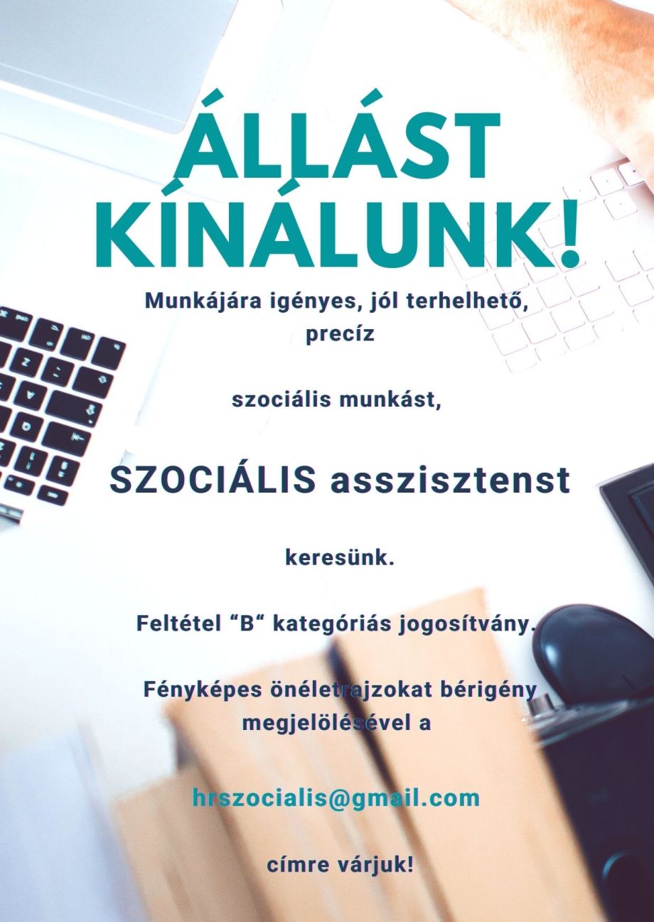 Szociális Étkeztetési Központ szociális asszisztens munkatársat keres hosszútávra az alábbi feltételekkel: SZOCIÁLIS ASSZISZTENS: - 4-6-8 órás munkaviszony - szociális munkás, szociális asszisztens végzettség - felhasználói szintű MS Office ismeret (…
